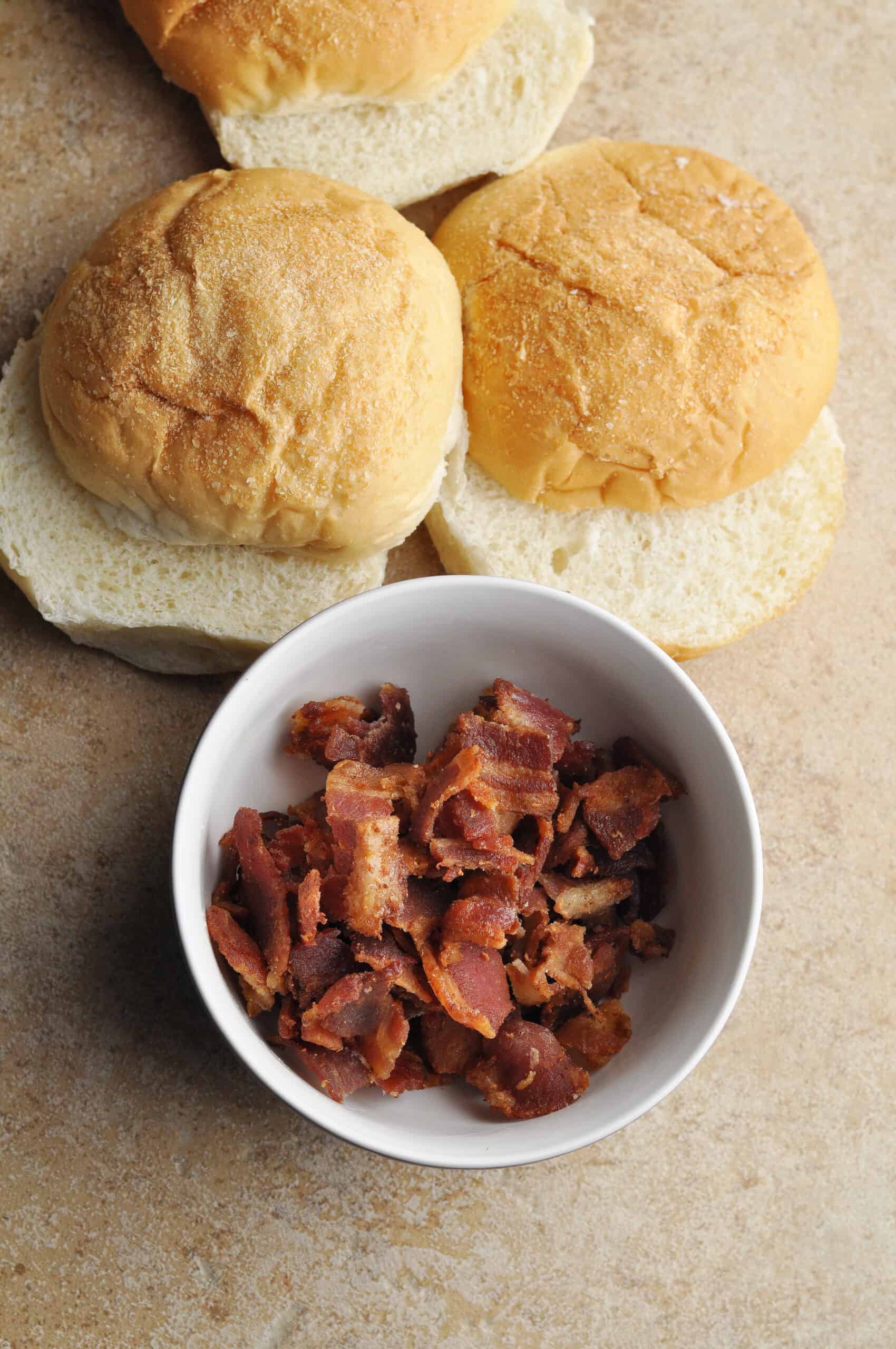Step 1: Slice rolls in half between top and bottom. Cook bacon until crispy. Drain, crumble. Preheat oven to 400, and melt butter with garlic powder as oven heats.