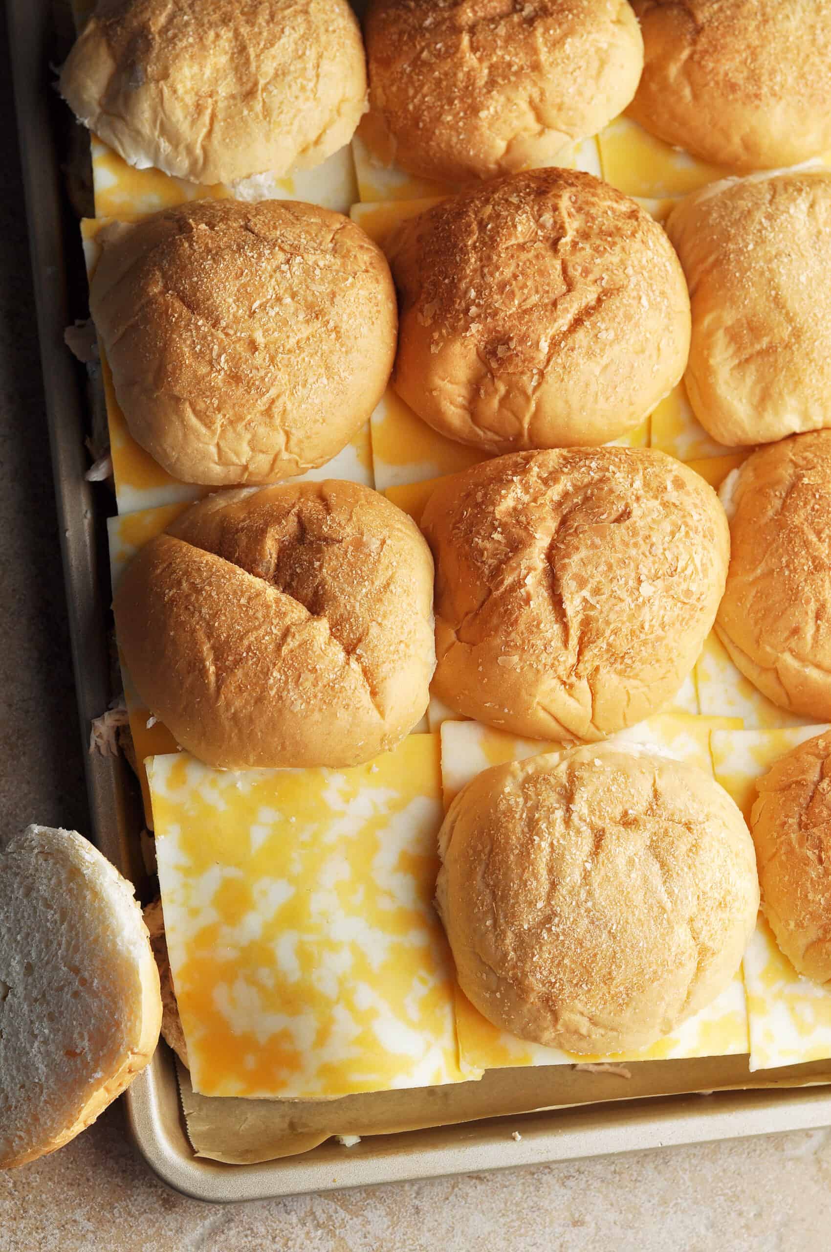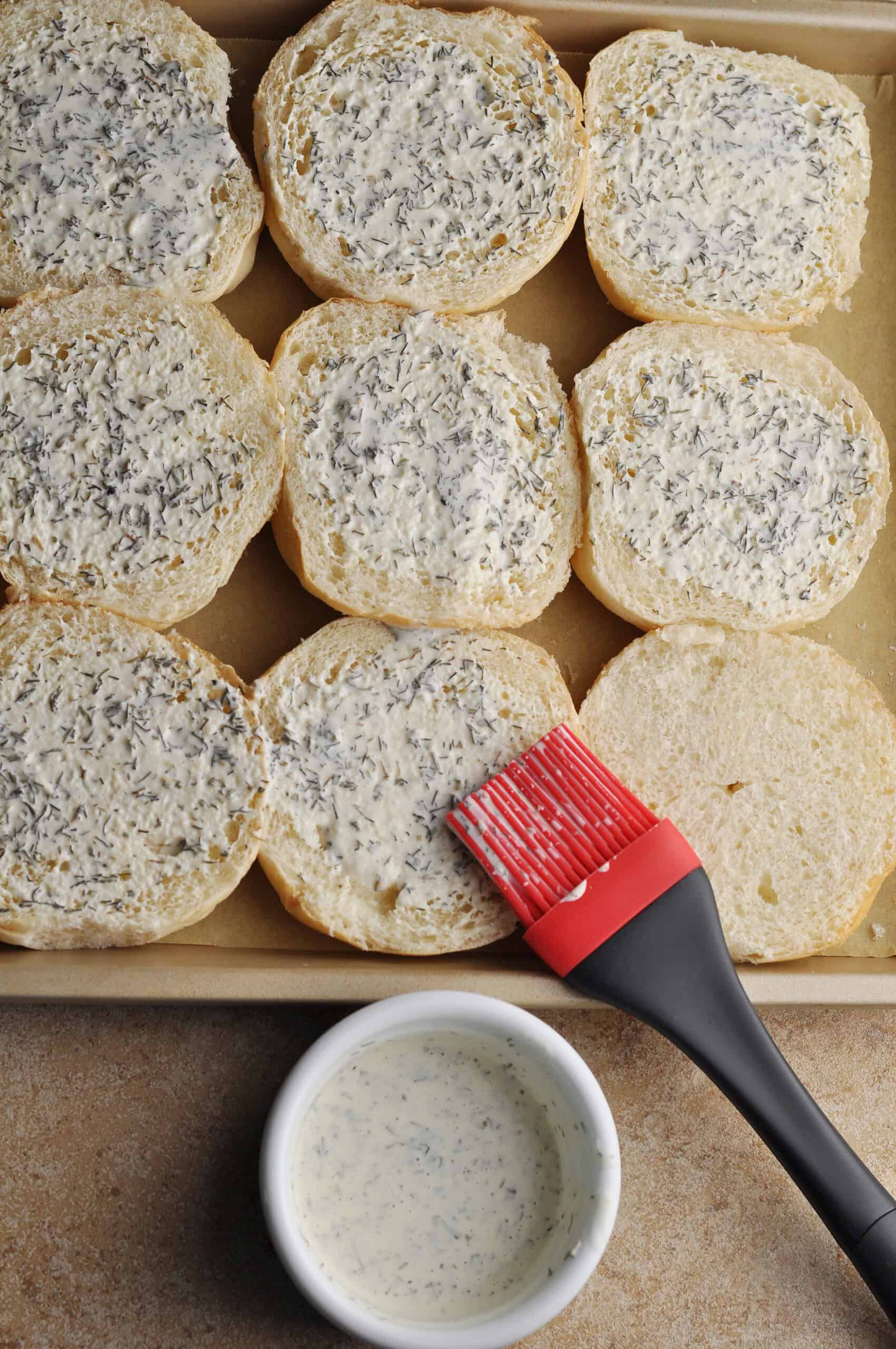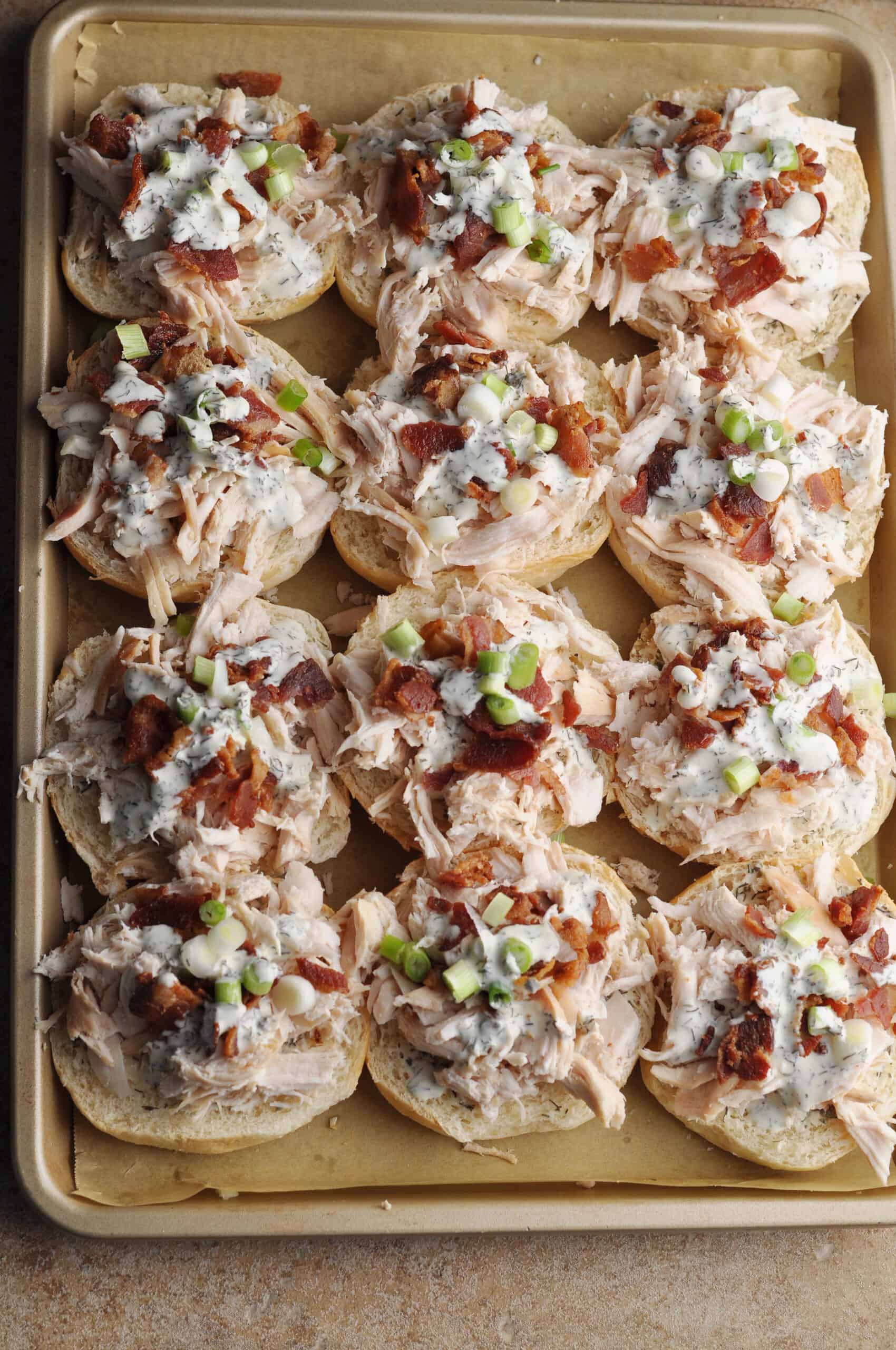 - Line bottoms of rolls on large baking sheet. Top each with a generous layer of ranch dressing.