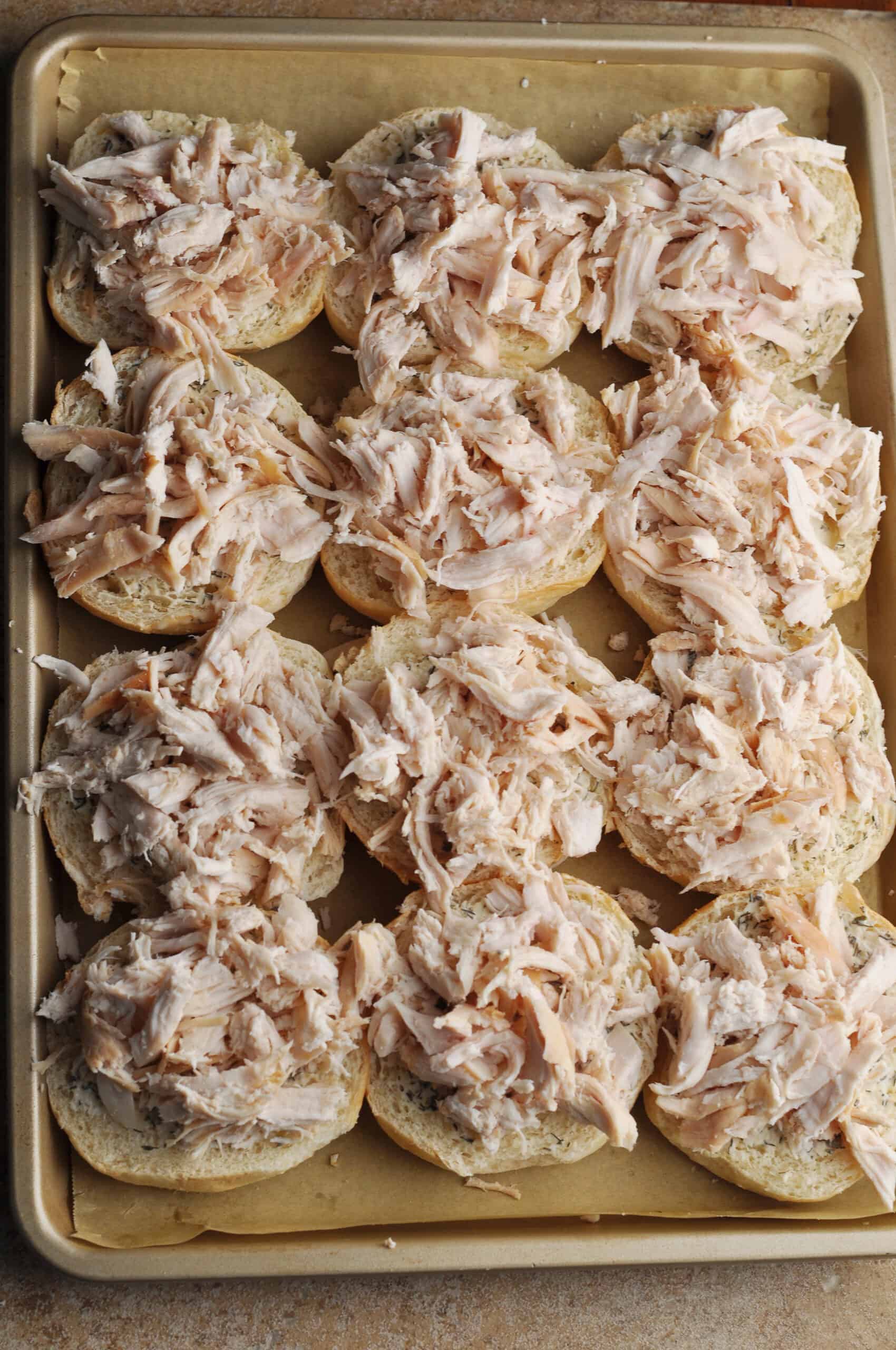 Step 3: Add a liberal amount of chicken to each of the bottom roll pieces.
