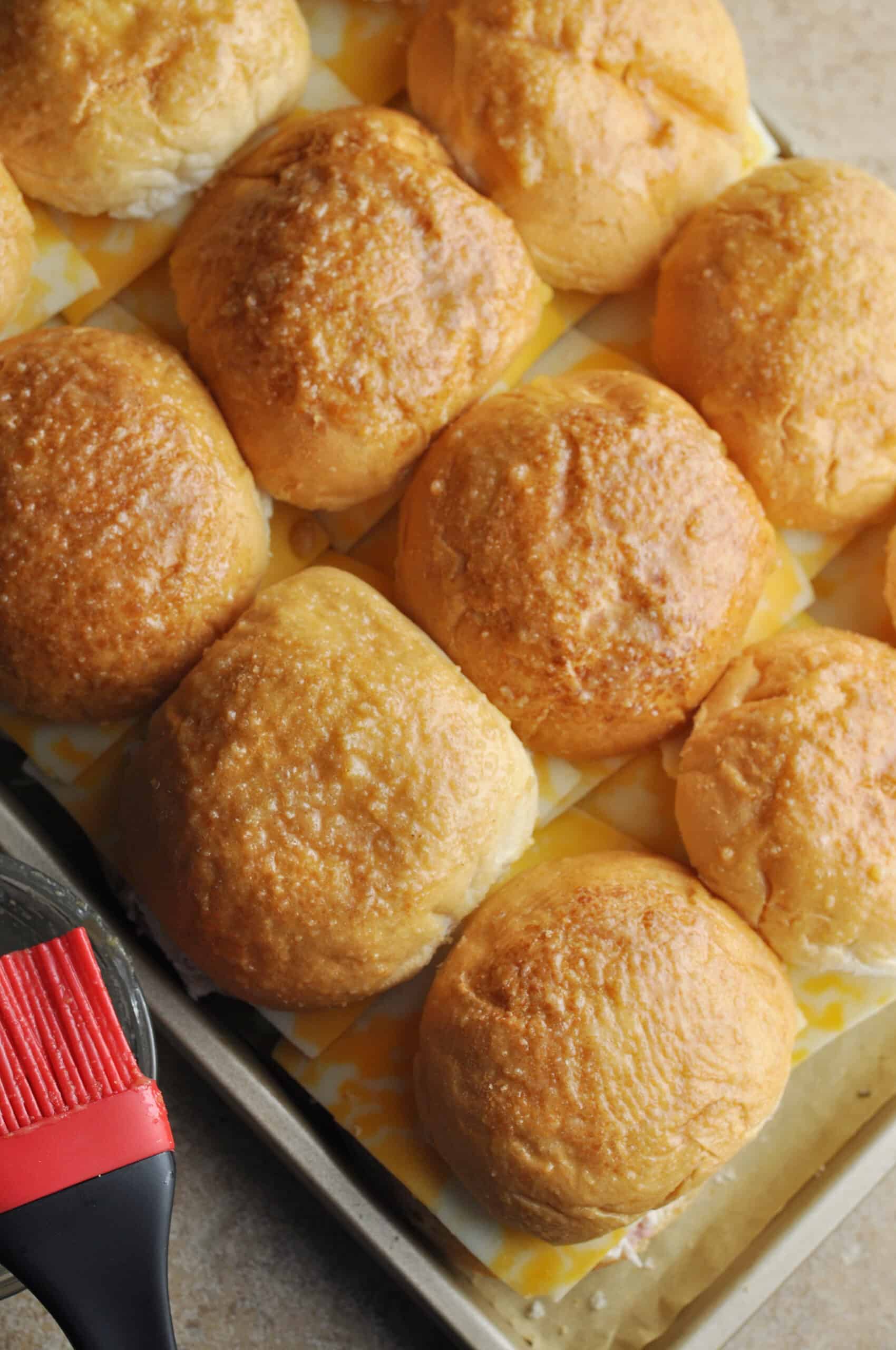 - Brush tops of rolls liberally with melted garlic butter. Cook 15-20 minutes or until rolls are browned and cheese is melty.