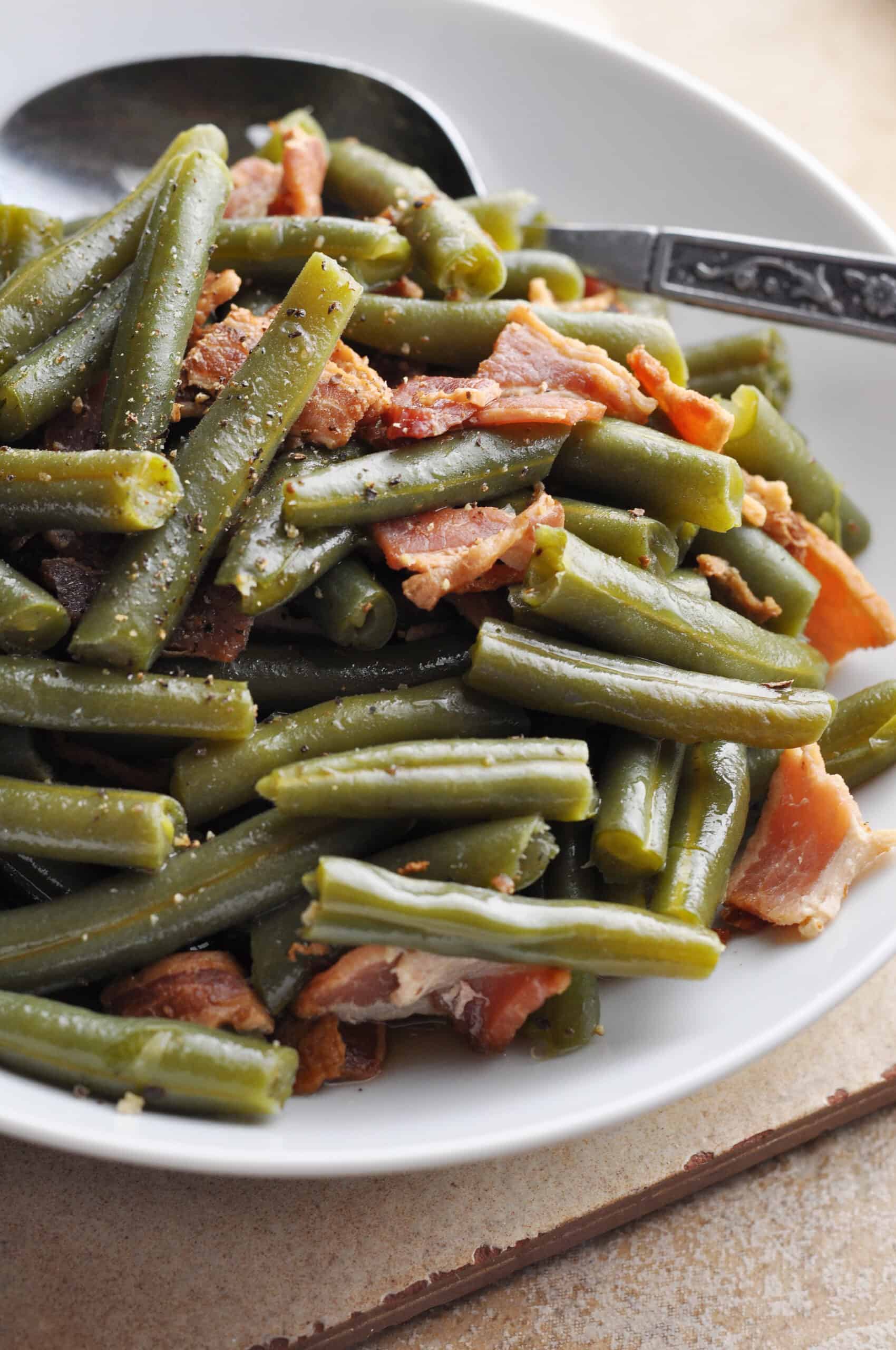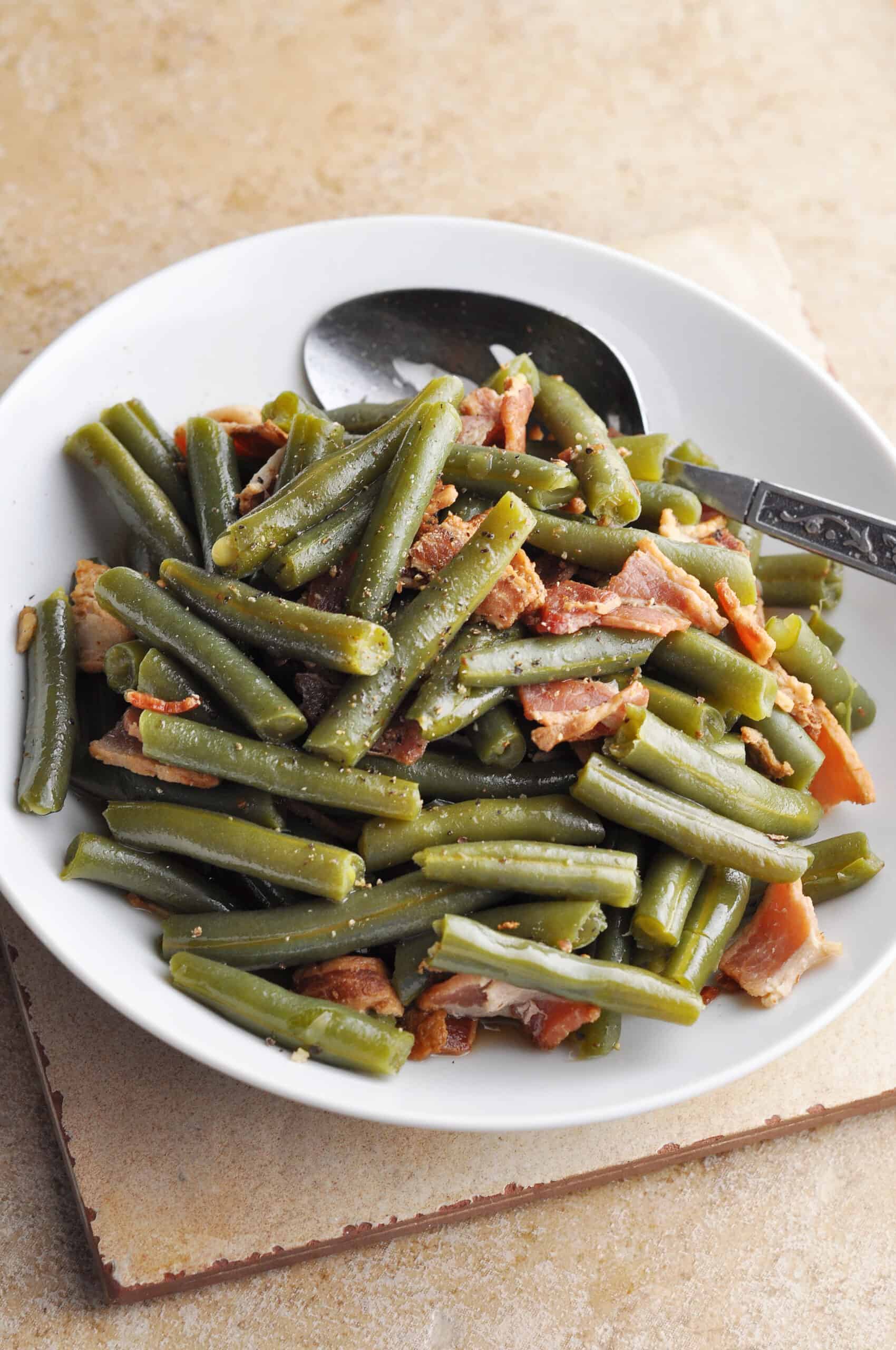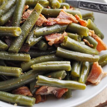This Southern green beans recipe with bacon has been my tried and true recipe for many years. Got it from my mom, who is a fabulous Southern cook. So simple, yet so delicious! You only need a few ingredients to bring out the delicious flavor of your fresh green beans!