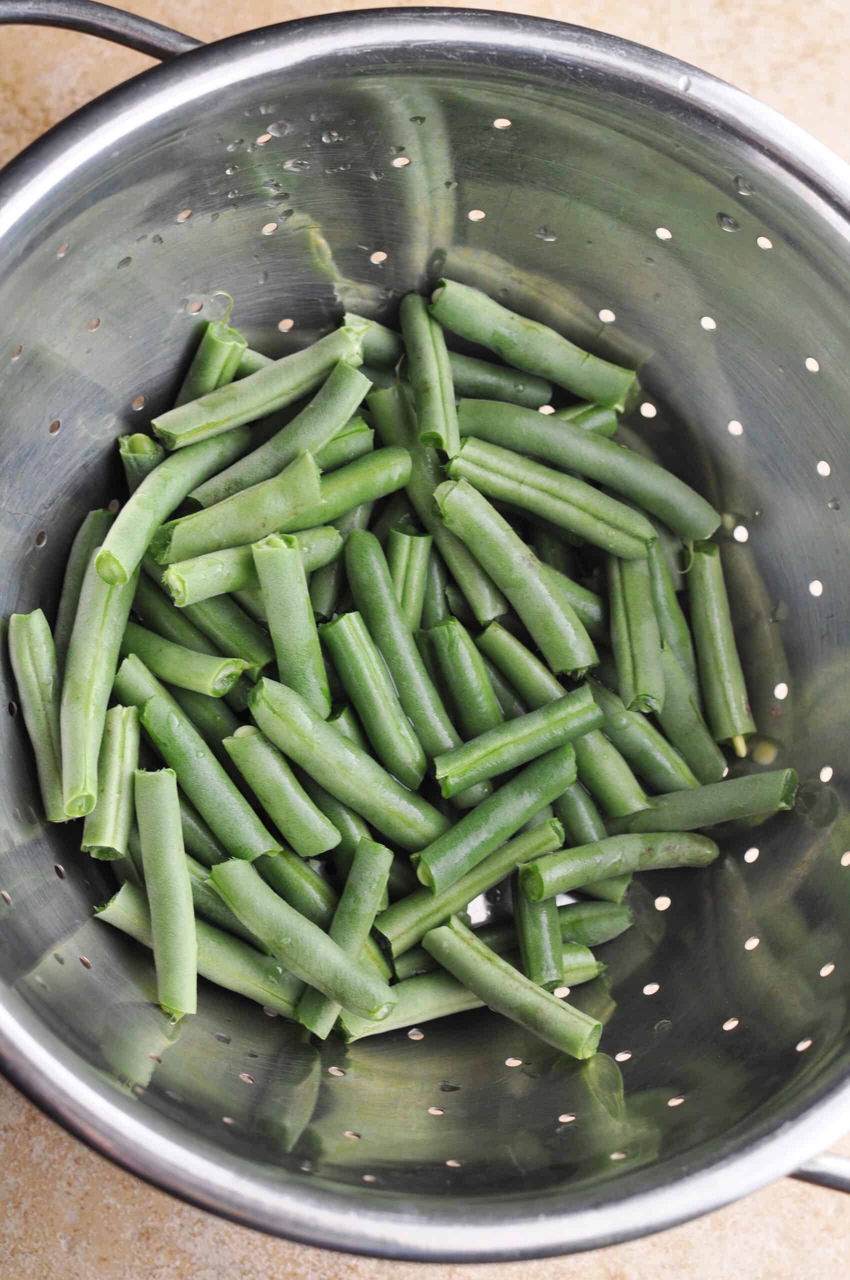 - Break green beans into bite-sized pieces and remove ends. Rinse with water in colander.