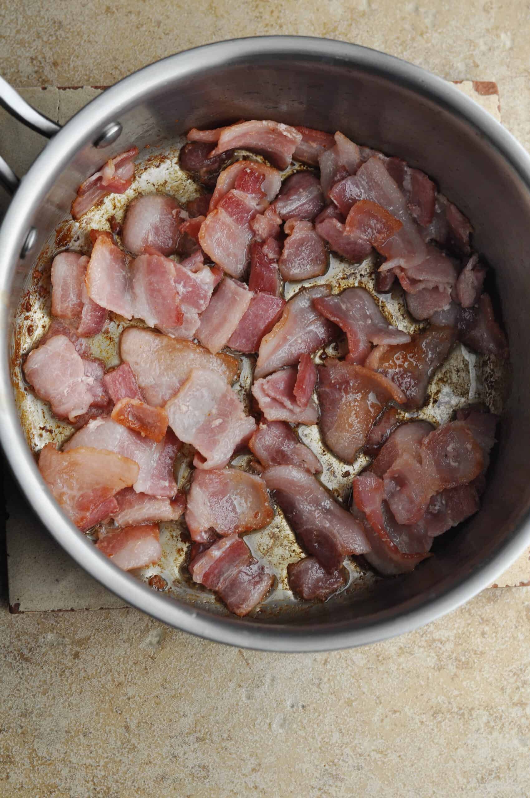 - For the bacon, I like to cut it up before adding it to the pan. This makes it easier to cook, avoiding the bubbling up of the long strips. Plus, you will want small pieces in the end for this recipe, so it's best to have them already cut up.