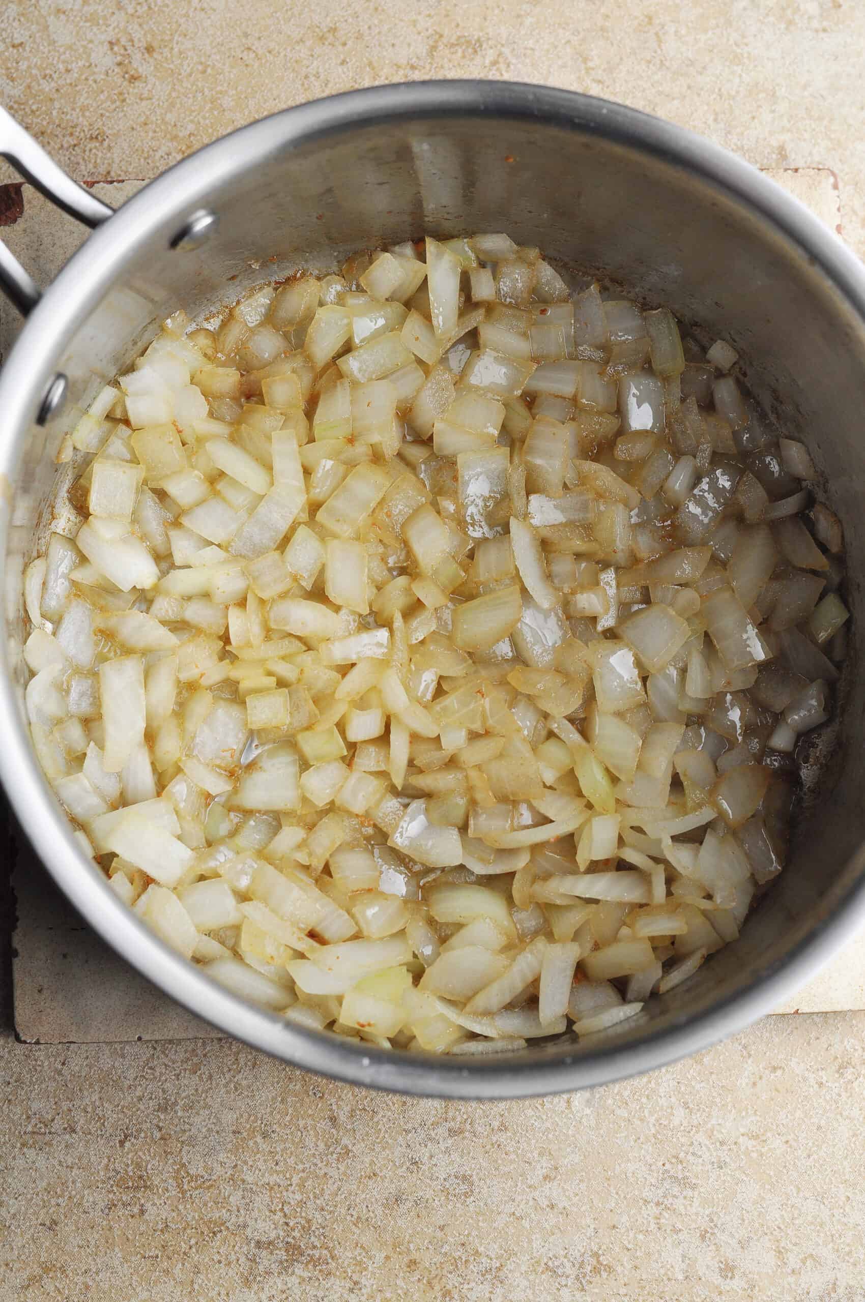 Step 3: Add chopped onion to bacon fat in the pan and cook until softened and lightly transparent.